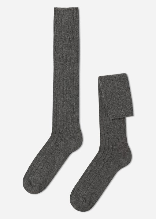 Calzedonia Men’s Ribbed Wool And Cashmere Long Socks | 042 – Medium Gray Melange | Men’s Socks