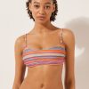 Fully lined bikini bottoms with invisible seams in order to not leave marks. The rounded waist at the front allows for both a classic or more high-cut fit, depending on one’s physique. A dynamic and sophisticated chevron motif, in bright colors on slightly ruched fabric, perfect for a modern and refined look.