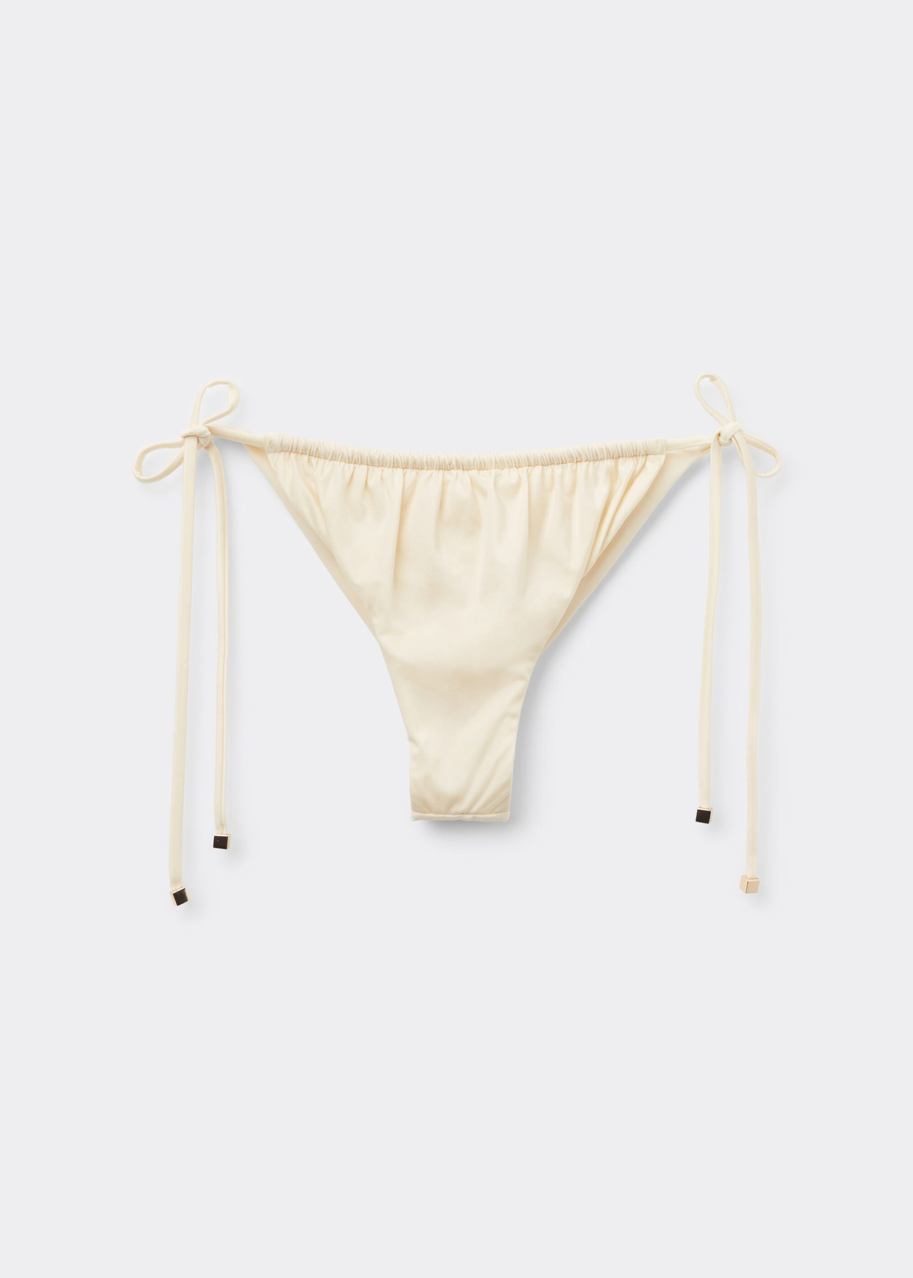 Brazilian cut bikini bottom with side ties to adjust the fit. The style features a bright fabric with a silky effect, embellished by ruffles and gold tips. Fully lined with invisible seams.