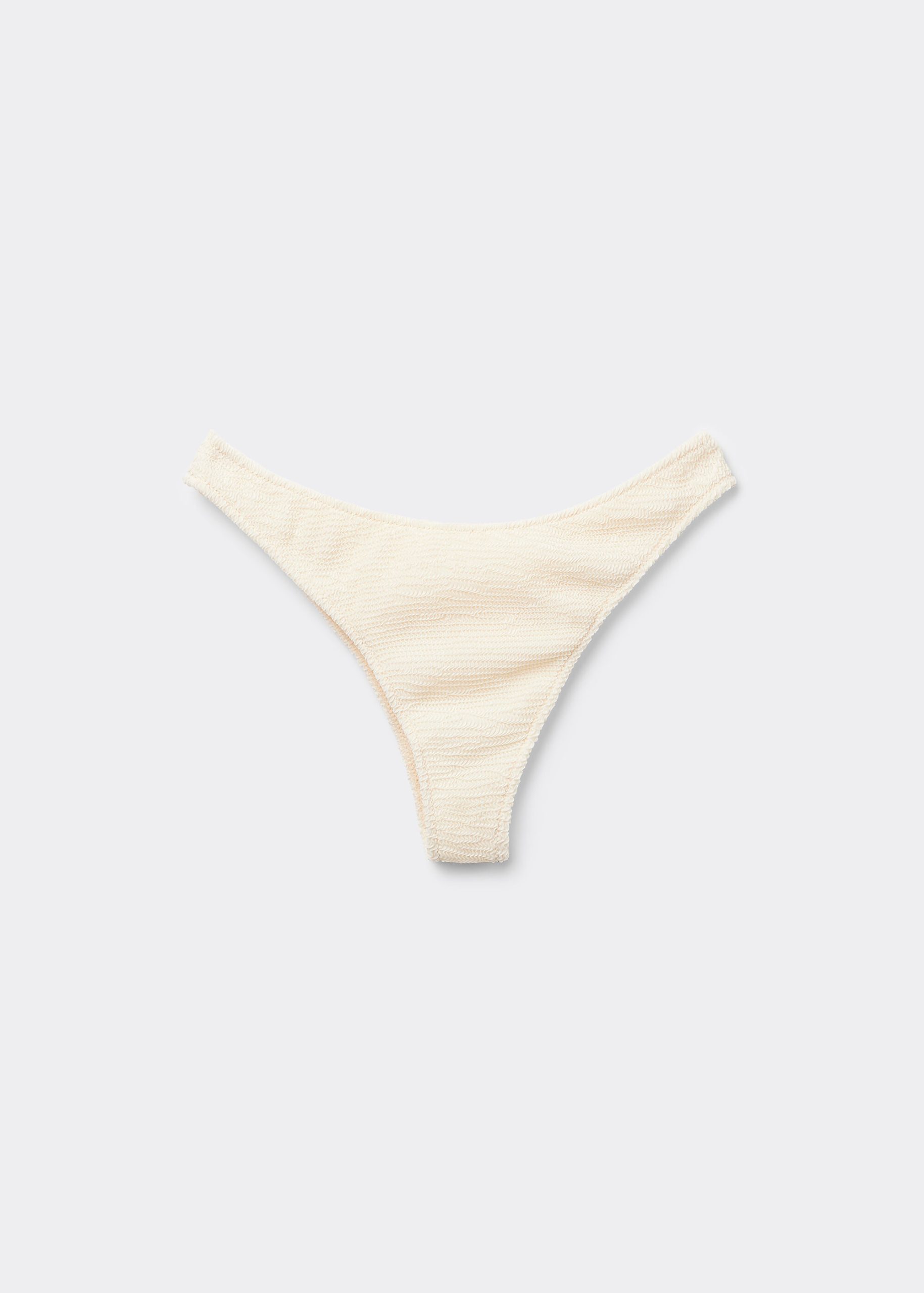 Fully lined Brazilian bikini bottoms. The slightly rounded waist at the front allows for both a regular and more high-cut fit, depending on one’s physique. The style features a crinkle fabric with a three-dimensional effect.