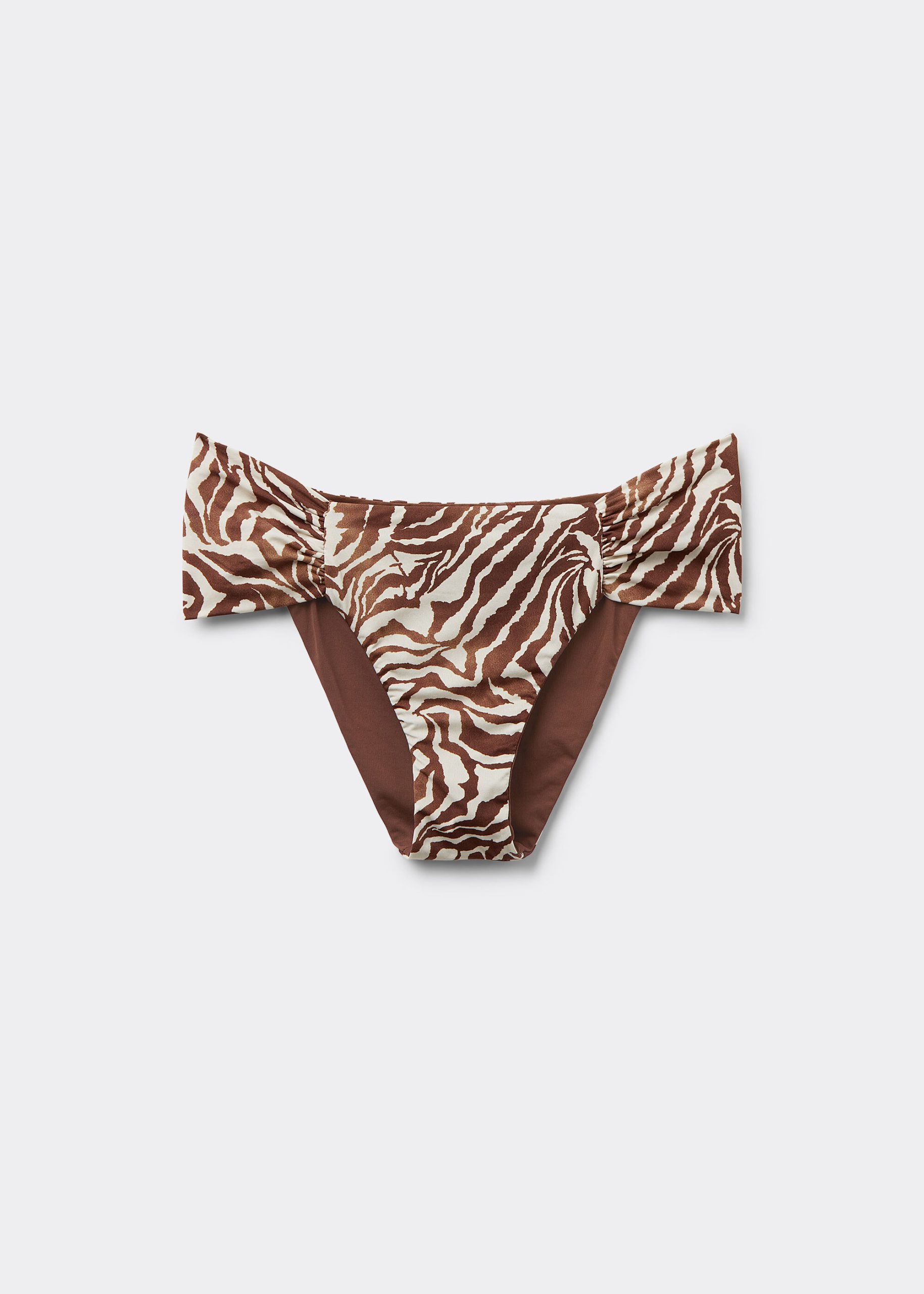Bikini bottom with draped fabric at the sides that allows the height to be adjusted. The style features a sophisticated Brown Zebra print. Fully lined with invisible seams.