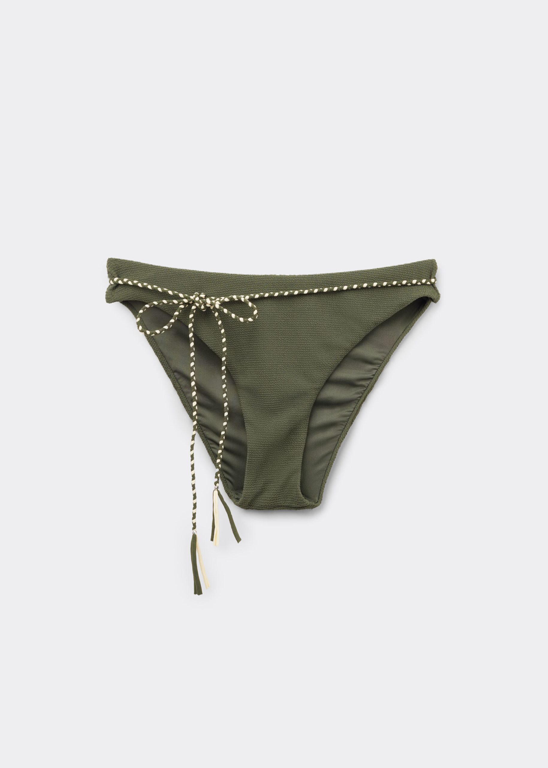 Fully lined bikini bottoms with invisible seams in order to not leave marks. The rounded waist at the front allows for both a classic or more high-cut fit, depending on one’s physique. The 3D-effect crinkle fabric, embellished with laced cording, combines elegance, comfort and coolness for a modern and distinctive summer look.