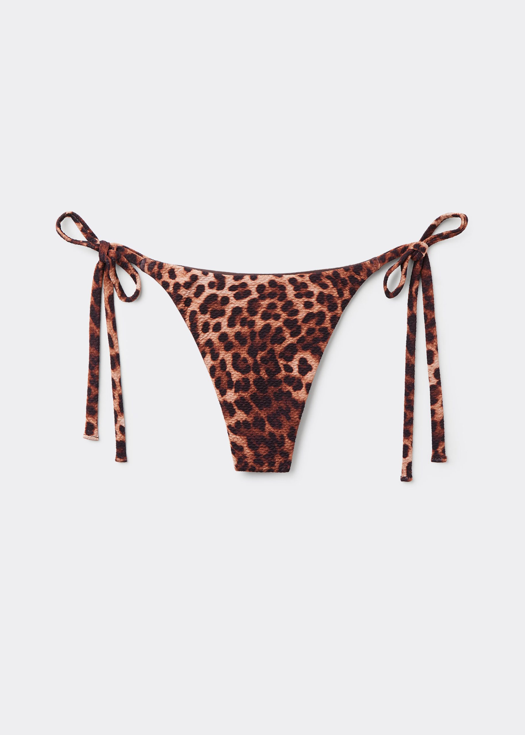 Thong bikini bottom with side string ties. The slightly rounded front allows for wearing it either as normal or with the legs higher on the sides to show off the physique. The style features an elegant animal pattern and lightly ruched fabric. Fully lined with invisible seams.