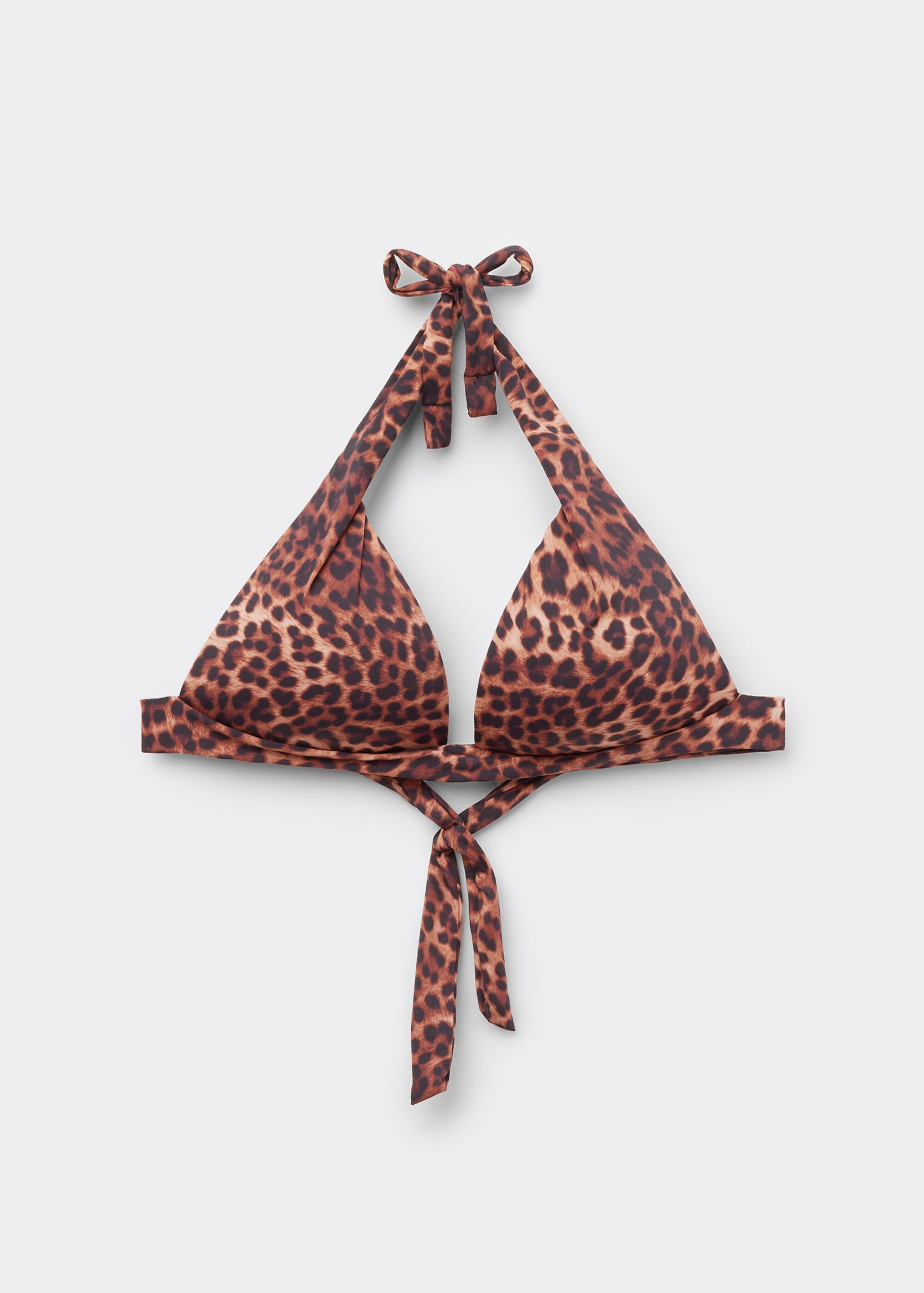 Wireless fixed triangle bikini top with graduated padded cups that add volume to enhance the décolleté. The style features an elegant animalier pattern and a precious accessory in the middle of the bust line. The shoulder straps with eyelets can be inserted into the band on the back or fastened behind the neck. Back bow closure.