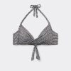 Fixed triangle bikini top with no underwire and graduated padded cups that add volume. The style features a black and white toned pattern embellished with a coated effect. The shoulder straps have eyelets on the ends so they can be hooked onto the back band or tied behind the neck. Back tie closure.