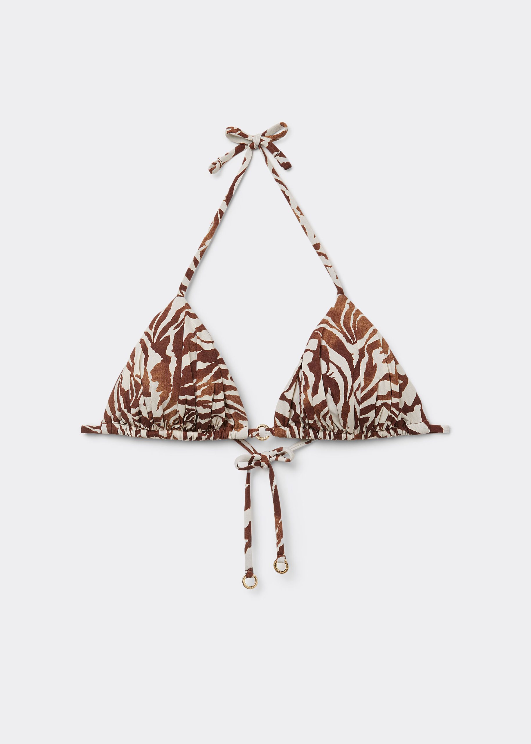 Wireless triangle bikini top with removable padding. The style features a sophisticated Brown Zebra print. The shoulder straps have eyelets on the ends so they can be hooked onto the back band or tied behind the neck. Back string tie closure.