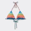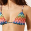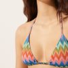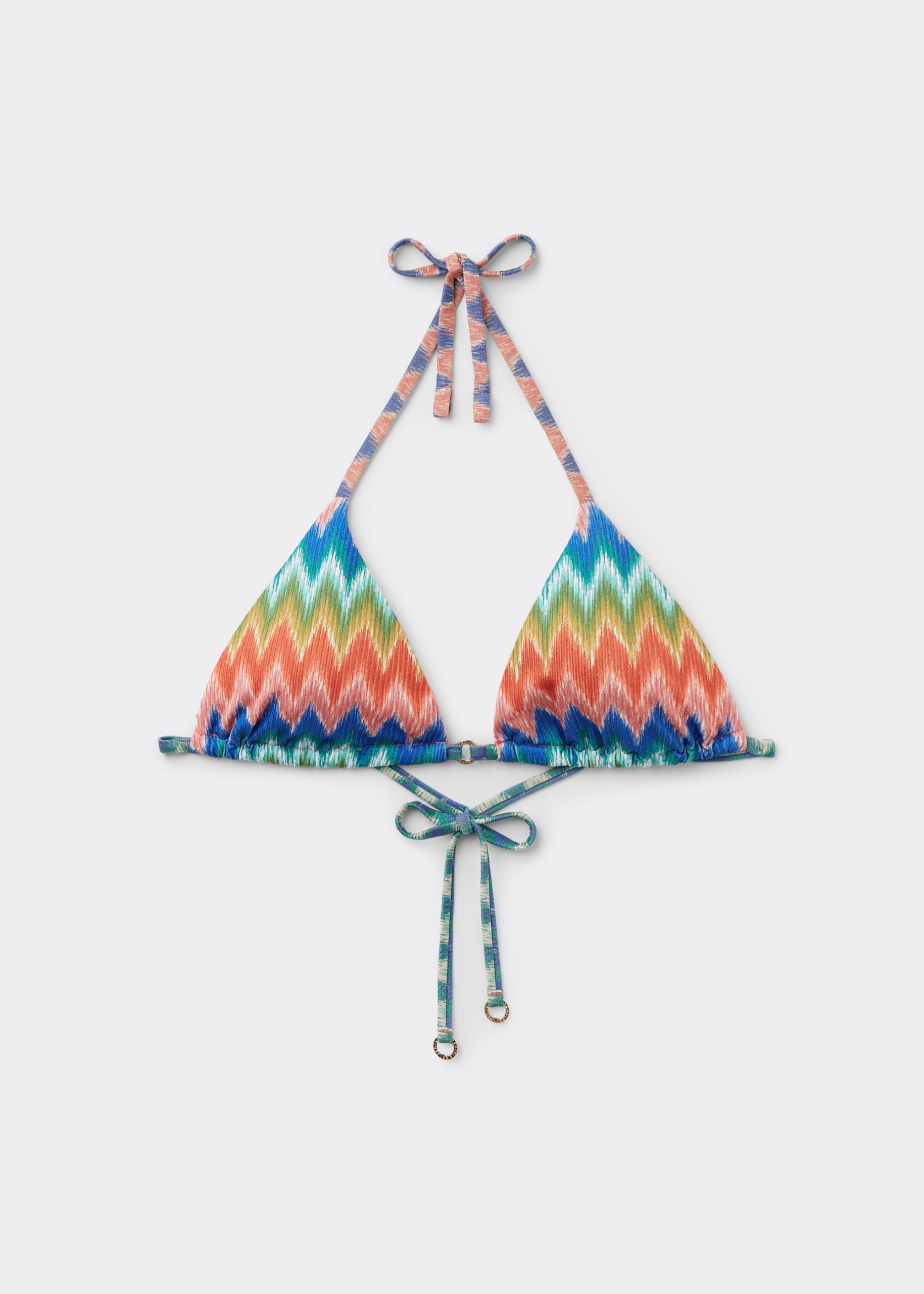 Slide triangle bikini top with removable padding, wireless for a natural effect. A dynamic and sophisticated chevron motif, in bright colors on slightly ruched fabric, perfect for a modern and refined look. The shoulder straps have eyelets on the ends so they can be hooked onto the back band or tied behind the neck. Back string tie closure.