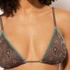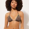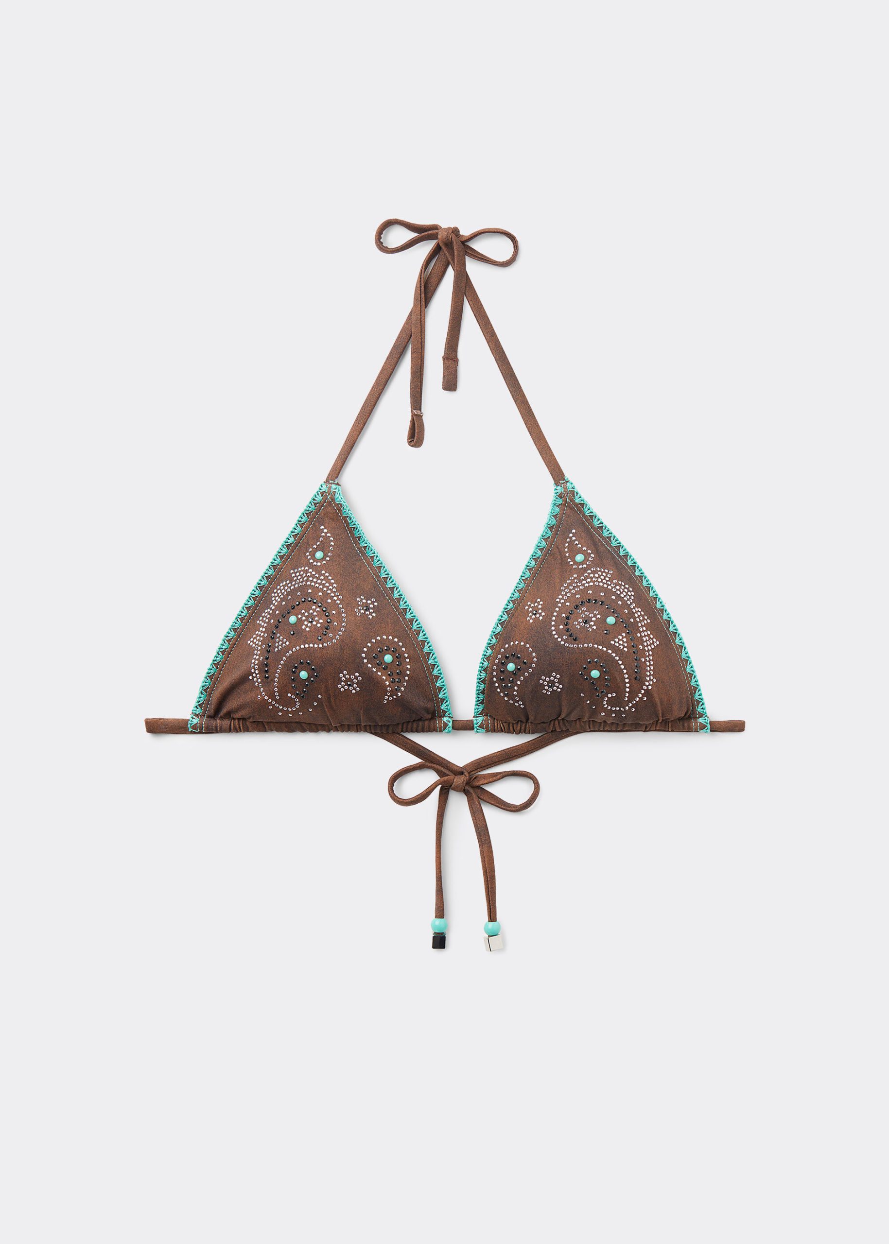 Slide triangle bikini top with removable padding, wireless for a natural effect. Triangle string bikini top with removable padding, wireless for a natural effect. Made from a buckskin effect fabric, enriched by studs and rhinestones for a touch of Texan style glamour. The shoulder straps have eyelets on the ends so they can be hooked onto the back band or tied behind the neck. Back string tie closure.