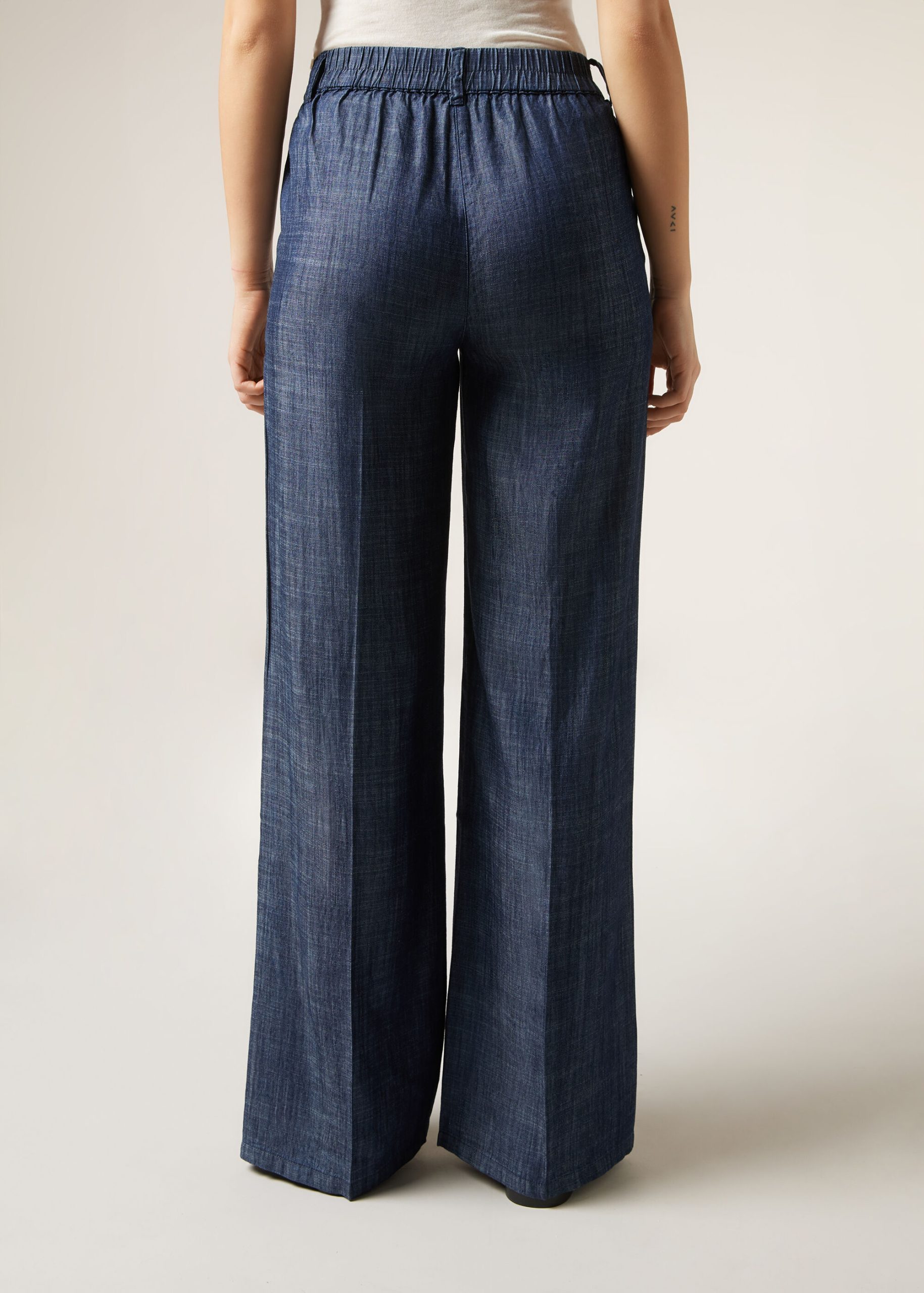 Palazzo pants with zipper, button, and belt loops. The elasticated waist ensures optimum comfort. Made from a particularly soft and comfortable fabric, they are ideal for achieving a casual and relaxed look perfect for any occasion.nThis model is made with TENCEL™ Lyocell fibers. nTENCEL™ Lyocell and Modal fibers are produced starting from wood, a natural and renewable raw material that scrupulously comes from responsibly managed forests. nThe wood collected from nature is balanced with the growth rates of forests in order to guarantee a continuous availability of this precious resource. nTENCEL™ Lyocell and Modal fibers give fabrics a natural softness, making them feel pleasant on the skin. nTENCEL™ Modal fibers help retain the softness of fabrics even after numerous washes.nThe fabric of this product contains 70% Tencel Lyocell low-impact modal by Lenzing.