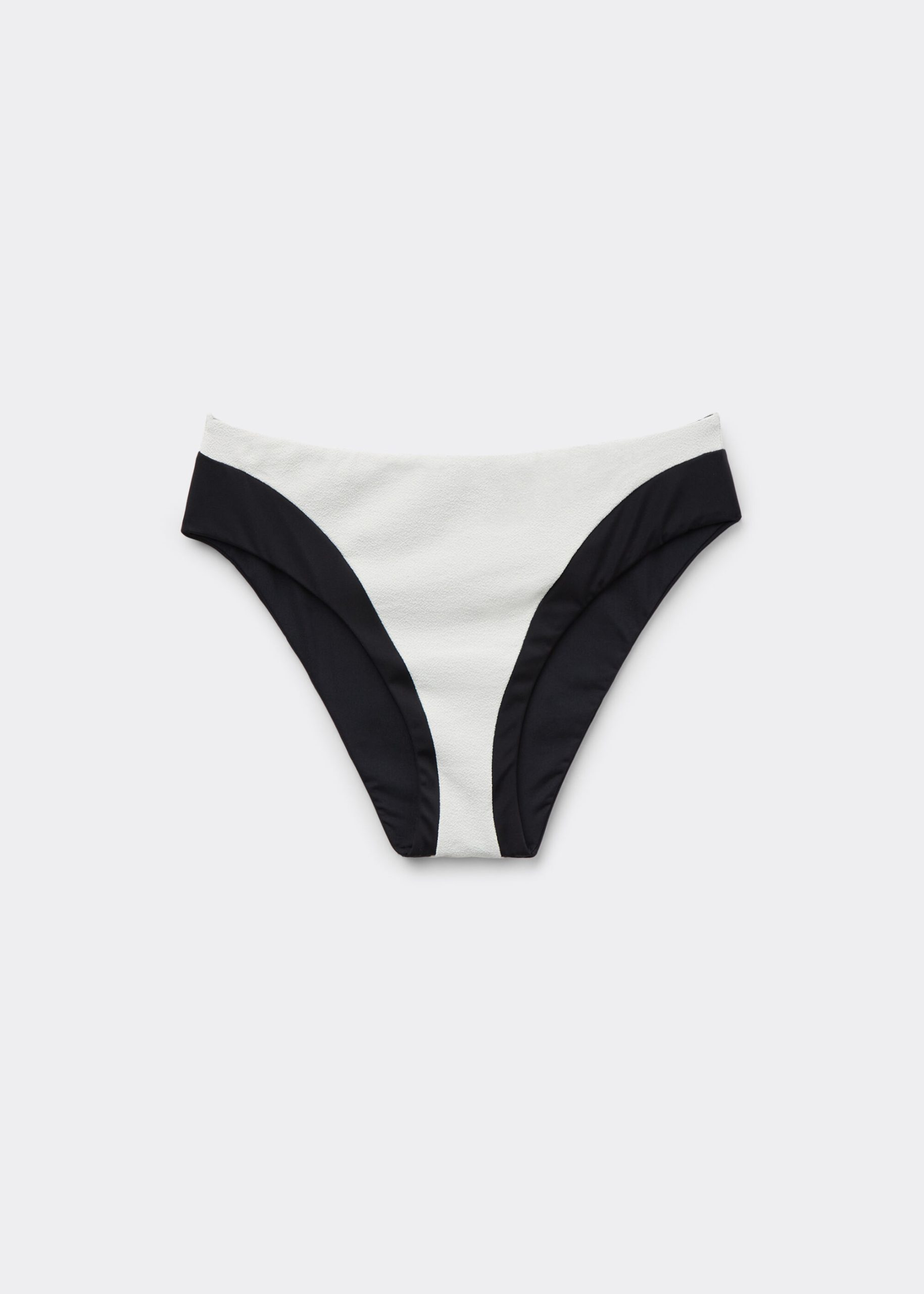 High waist bikini bottoms featuring a refined design. It stands out due to the elegant layering effect that adds a touch of fashion and sophistication, perfect for a chic and modern summer look. Fully lined with invisible seams.