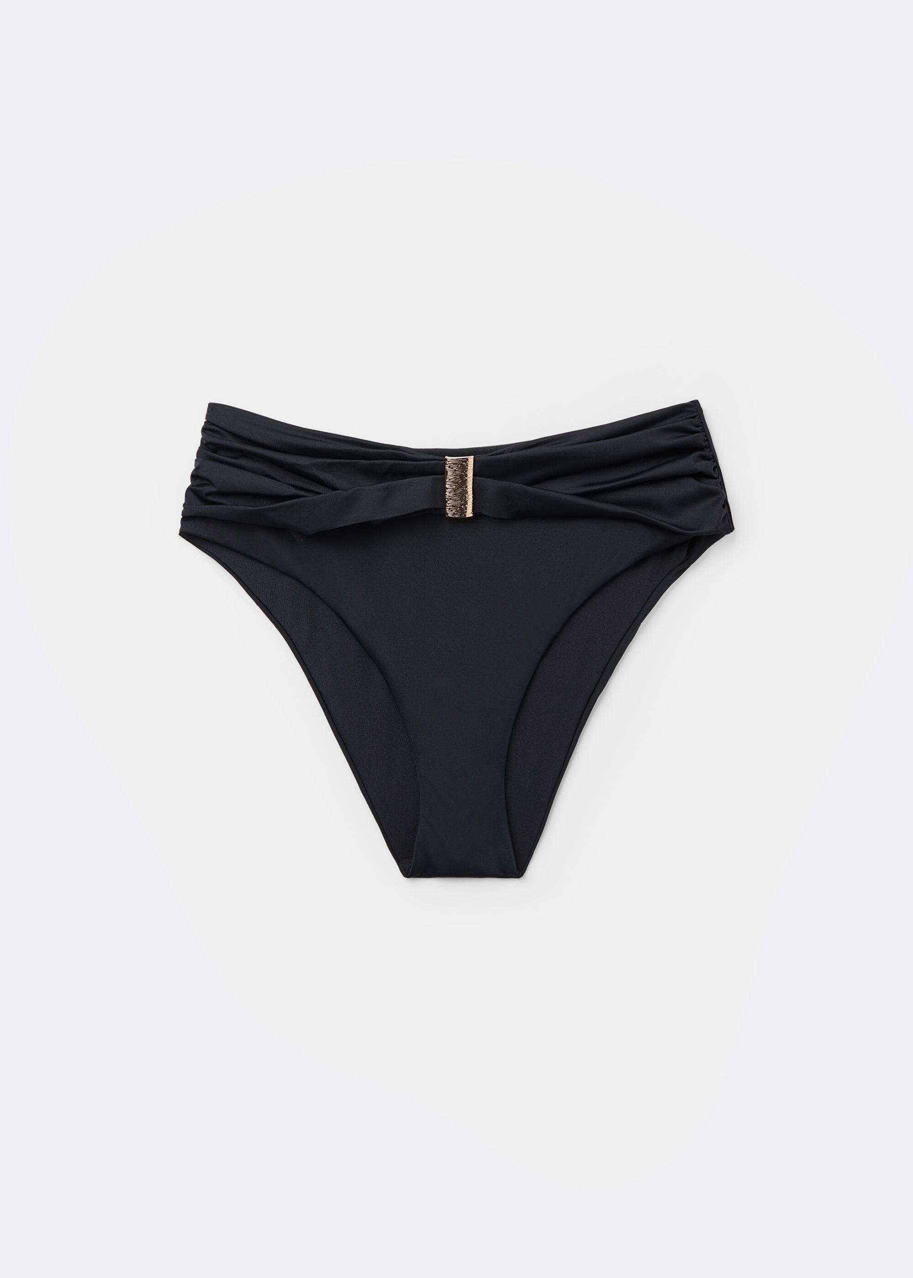 High-waisted bikini bottoms with draping and mobile golden accessory with a shaping effect on the abdomen. The compact fabric, designed to exalt and enhance the body’s curves, ensures excellent containment on the abdomen and is studied to make every woman feel at ease without constraint. Fully lined with invisible seams.