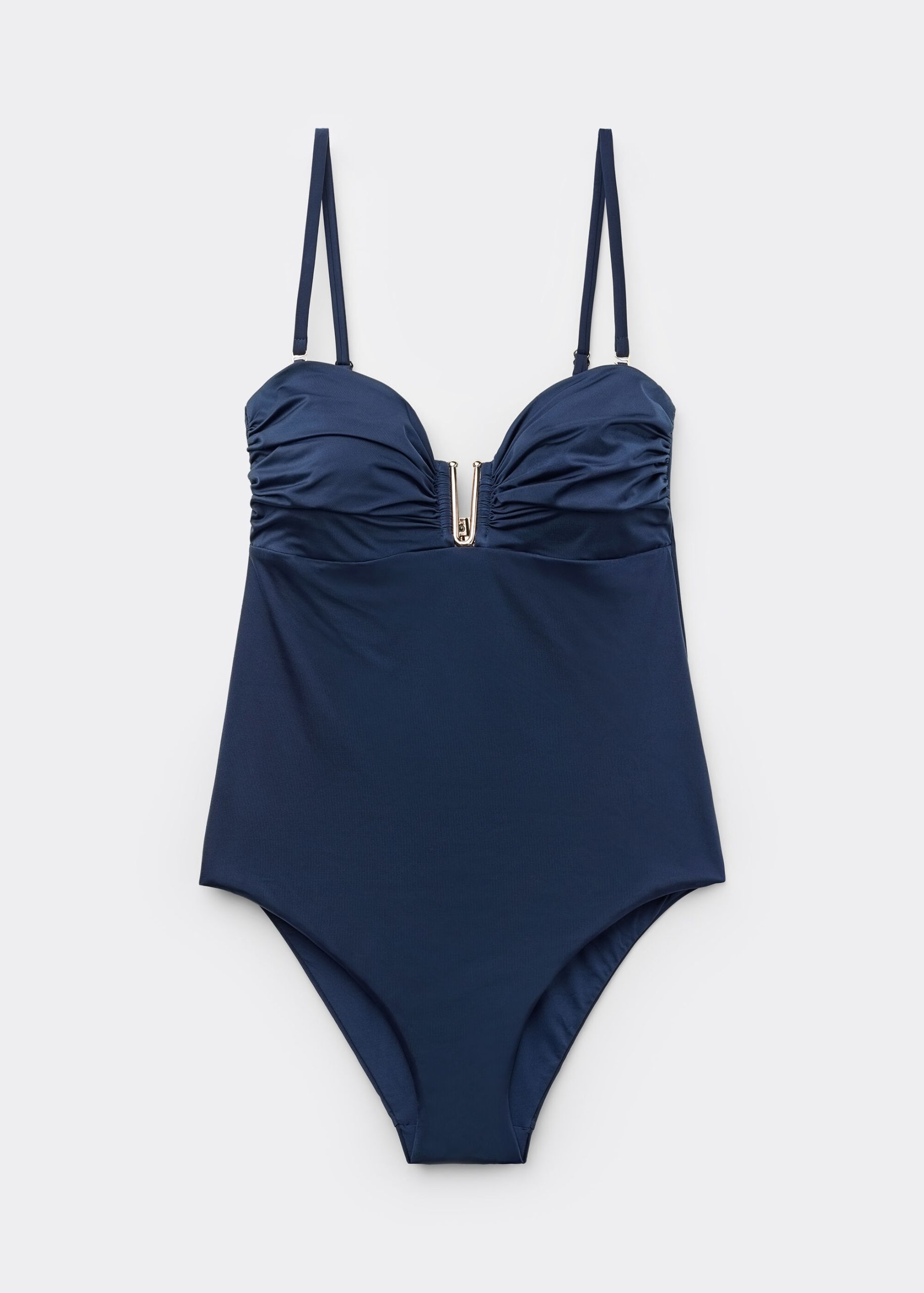 One piece wireless swimsuit with lightly padded cups embellished with an elegant gold accessory. The style features a particularly soft and comfortable bright fabric with a silky effect. Removable straps. Regular fit on the bottom. Fully lined.