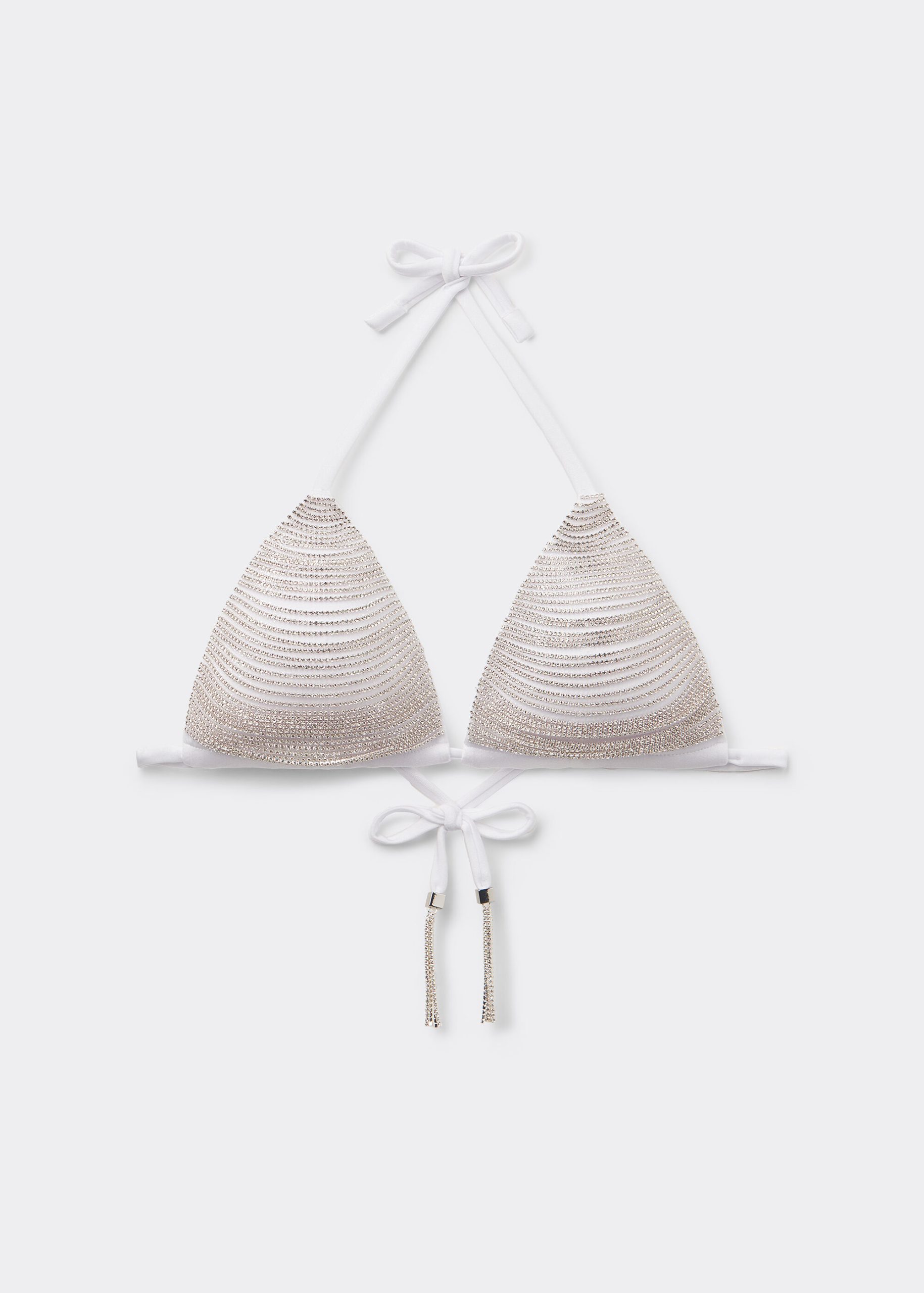 Wireless triangle bikini top with light internal padding. The shoulder straps with buttonholes can be inserted into the band or fastened behind the neck. Fastens with a string tie in back. Shine in style in this exclusive top, embellished with gemstone threads. The perfect top to pair with your glamorous evening outfits. PLEASE NOTE: this garment has been hand embellished. Each garment is unique. Due to the delicate nature of this garment, please take care when washing.